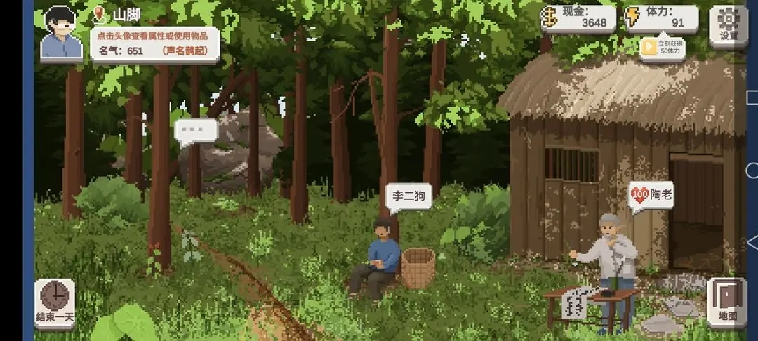 李二狗(聊天概率获得上山buff增加上山寻找好东西的概率)陶老(聊天获得10教学经验概率会跟陶老进屋喝茶获得20体力)陶老是好感度升段名声要求最高的,到100需要450的名声。这里还会出现随机的草莓(加10体力),蘑菇,竹笋,上山寻找会获得草莓,辣椒,蘑菇,木耳,野葡萄(加20体力),蜂蜜(加30体力)还有两个值钱的我忘了