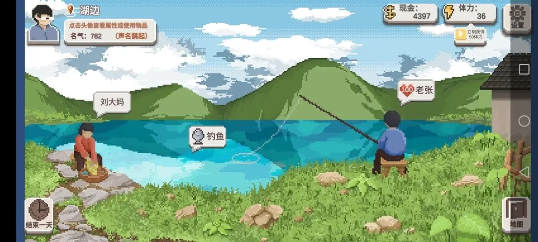 刘大妈(聊天概率获得一个柿子)老张(请教获得钓鱼经验或概率获得一条锦鲤)老张是三个人物中名声需要最低的,好感度升满最后会获得一个老张的鱼竿我称之为第二神器,当你获得了这个鱼竿就去市场买高级鱼饵,然后来这里钓鱼(好鱼一开始的时候难钓慢慢来就习惯了)我是靠钓鱼发家致富的,当然前期不需要买鱼饵,在印刷厂(必刷一个),湖边,市场,田园,操场会概率刷蚯蚓(5体力)