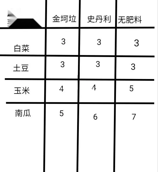 为了探究怎样才能更有效率的种田赚钱,我们种植不同的农作物,使用不同的肥料,观察他们成熟所需要的天数(以农业技能满级,集齐所有农业相关的收藏品为前提)。
