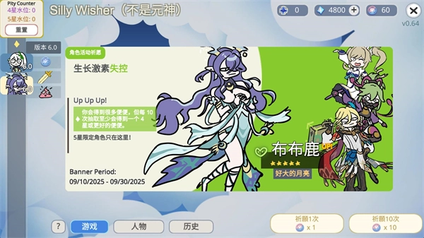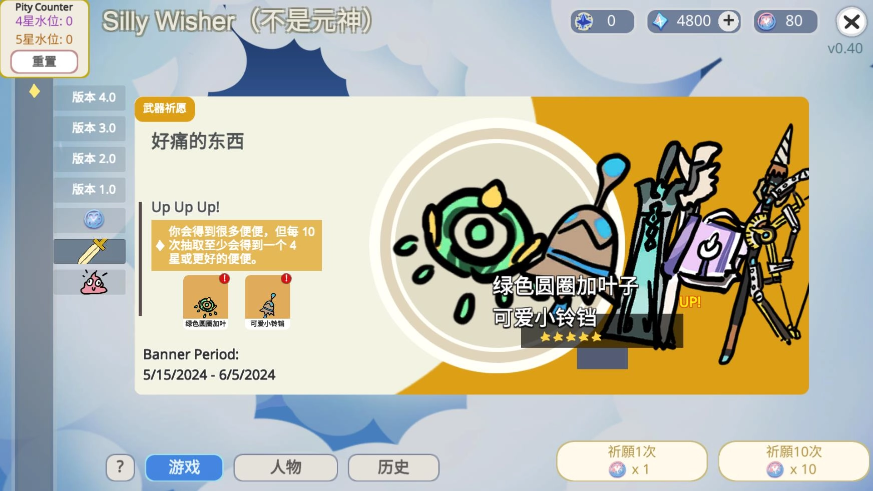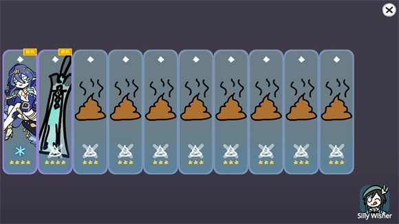 Silly Wisher是B站UP主sketchi自制的抽卡小游戏,玩家能抽取原神中的角色。游戏涵盖了从开服至今所有版本的角色与武器卡池,并且所有资源完全免费,无需花费任何费用,玩家可以自由选择想要抽取的角色,游戏概率也高度还原,还在等什么,快来试试你能多少抽出金吧。