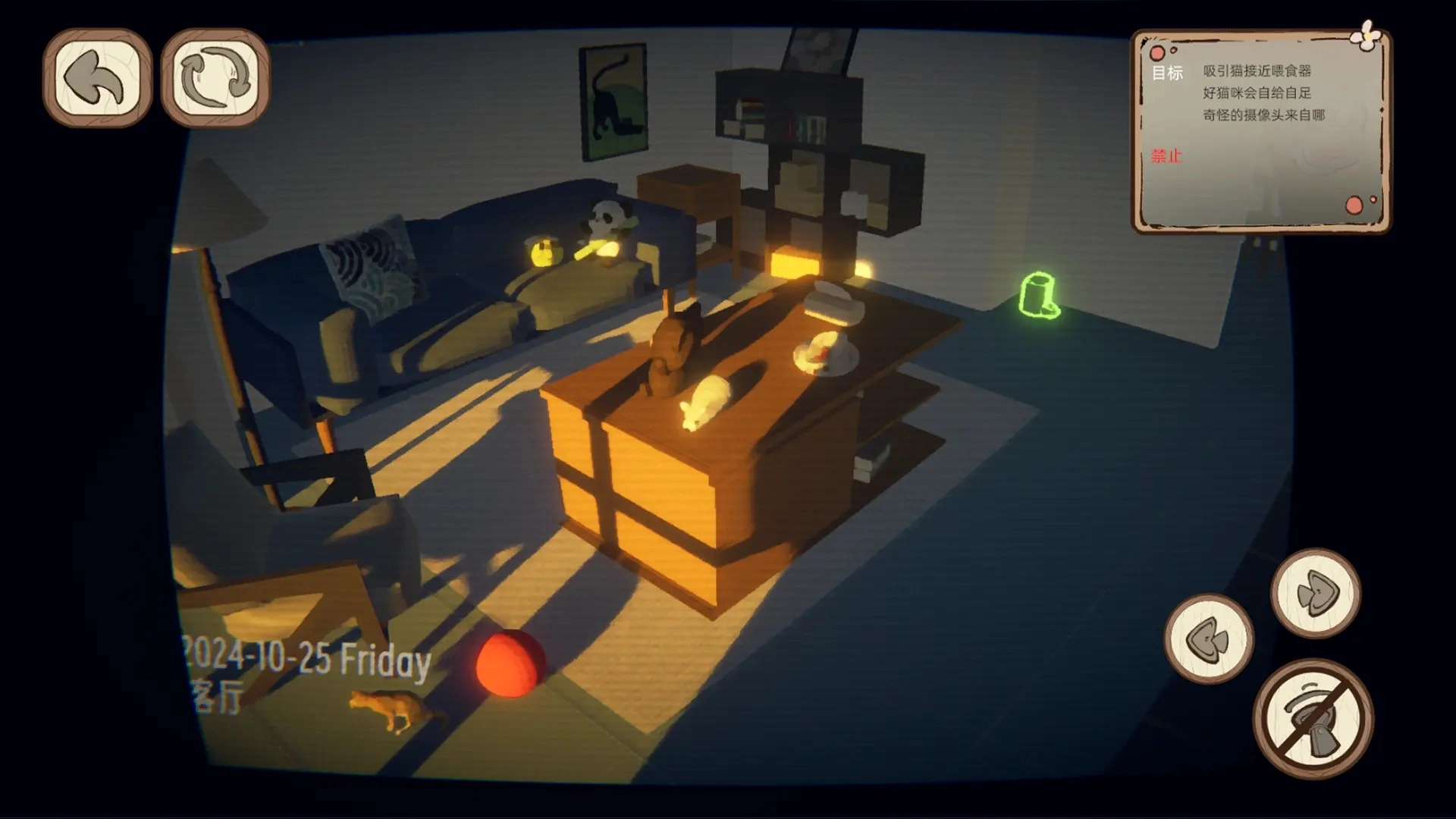 游戏以独特的监控摄像头视角开启,借助监控摄像头发射的激光来引导猫咪的移动轨迹。