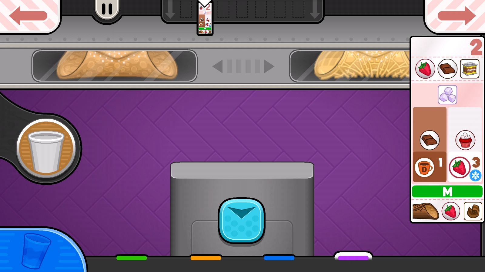 6、配料的话,从左到右依次添加。奶油必须对准中间,挤酱和撒料需要注意,头先对准中间挤,之后匀速右左右左,当然你要左右也行,不建议不到最右最左挤,因为这样也会扣分。但是你觉得麻烦只想拿九十多高分可以直接对准中间不动杯子。