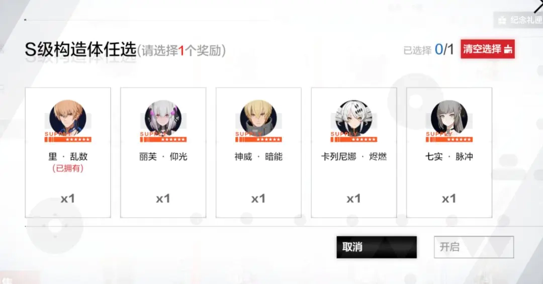 【新手S自选包】(五台机体任选其一):这个选择对入坑没什么影响,挑个自己喜欢的就行,也可以选丽芙·仰光当工具人用~不会干扰后续的养成和战斗节奏
