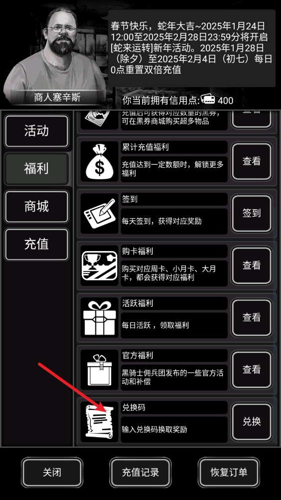 兑换方式:点击商城,然后在福利页面的最下方点击兑换,输入兑换码即可。