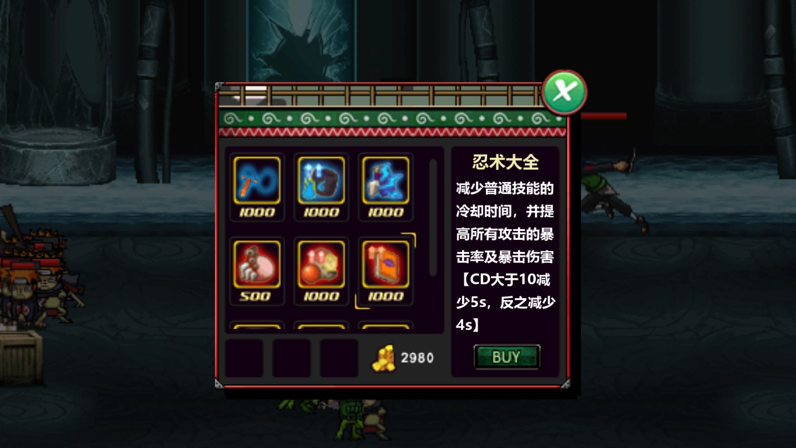 4、里面有多个装备,比如烟雾弹、查克拉护腕、查克拉手里剑等,花费一定金币就能购买使用。