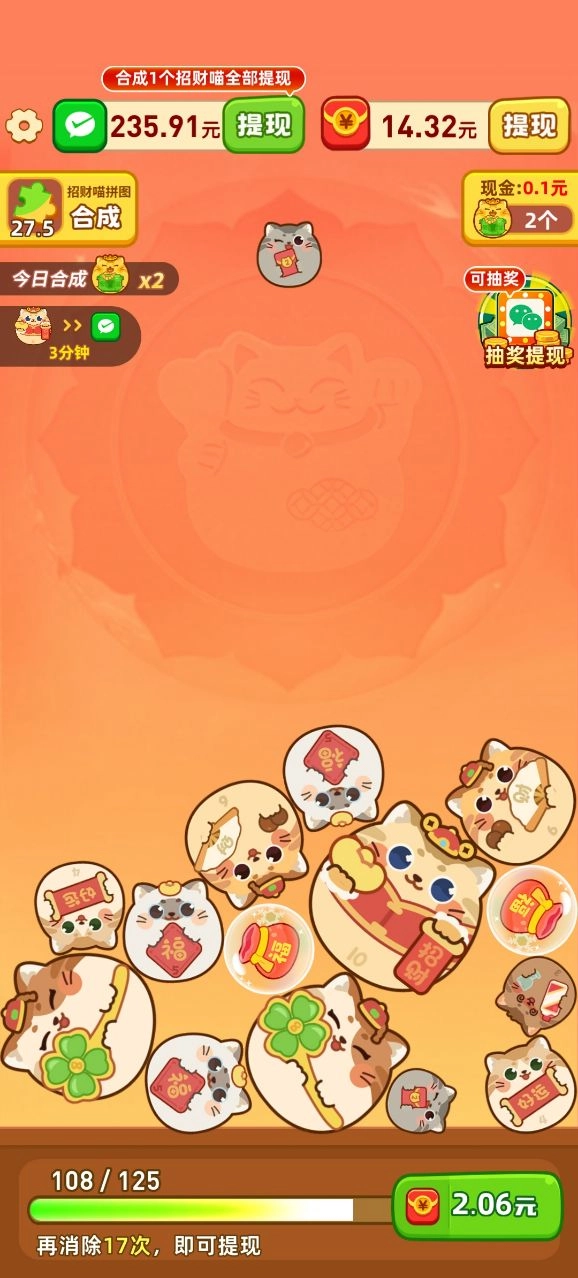 2、合成第一个招财猫就能提现红包,直接秒到账,合成第二个招财猫也是如此。