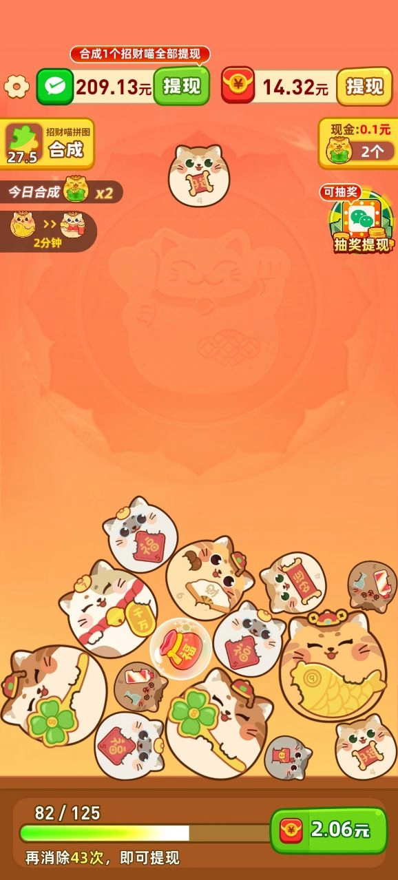1、玩家初始兑换比例设定为1%,后续只要合成6个招财猫,该比例就能提升至1.2%。如此一来,玩家可提现的红包金额会更多,同时合成招财猫的难度也处于较为适中的水平。