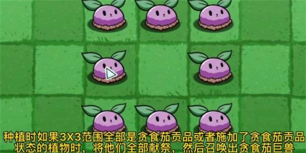 1、在种植的时候,只要3X3中都是这个贪食茄贡品,或者是施加了贪食茄贡品状态的植物,这样就能直接召唤出贪食茄巨兽。