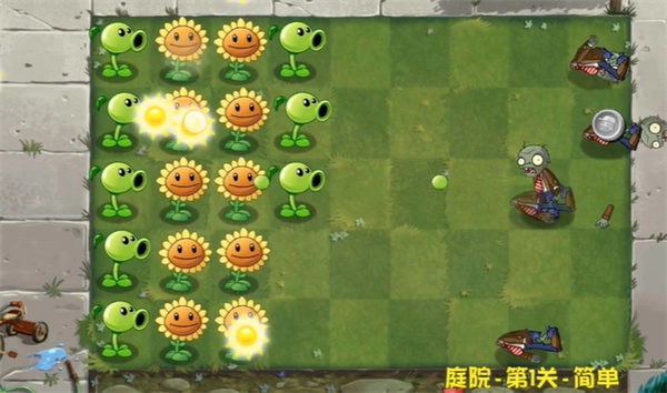 5、等到一大批僵尸来袭,就能快速种植足够多的豌豆射手,全部消灭后,就能过关,自然也会解锁新植物坚果。