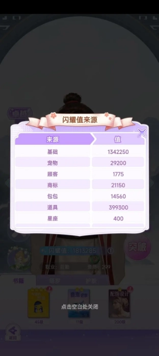 2、基础:顾名思义就是我们拿到员工的基础闪耀以及升级+突破的闪耀。还有一些特殊道具给的闪耀,例如礼服店氪金12元的家具,可以加员工闪耀。这里氪金的比较少,但提醒是突破道具要囤,后面很缺。