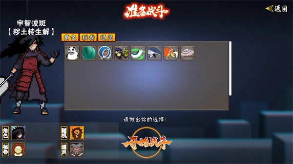 2、再去选择一个忍者,比如宇智波斑,还要选择秘卷,以及通灵兽。