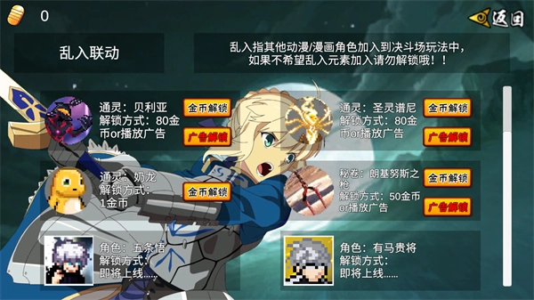 2、可以在里面看到很多联动角色,一共有两种解锁方式,一个是金币解锁,还有一个则是看广告解锁。