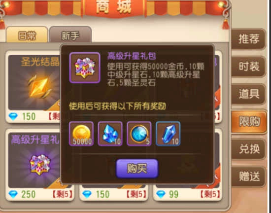 此外还有一个省钱的小技巧:商城--限购--高级升星礼包