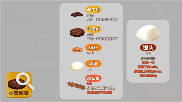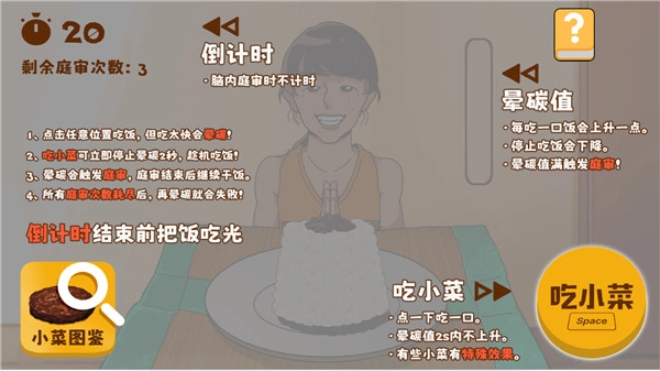 1、游戏的目标是快速吃饭,但速度太快会引发晕碳,得时刻留意节奏。
