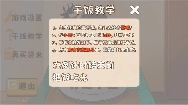4、玩家需要在倒计时结束前吃光所有的饭,注意时间管理和效率。