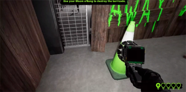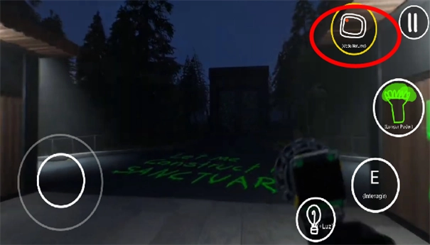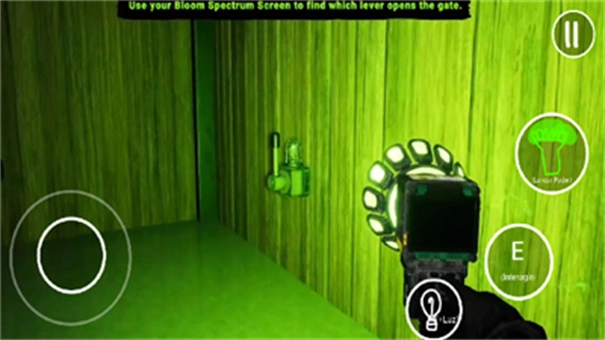 点击play进入游戏,在主界面,左侧是虚拟键控制前后左右移动,右侧则E表示射击开门,靠左边的是换灯具,照亮,最上面的是抓取碎片