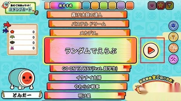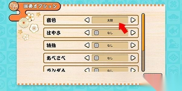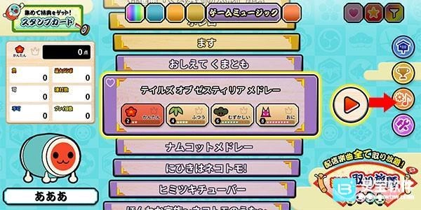 7、若要切换太鼓的敲击音色,可在歌曲选择界面点击右侧第三个按钮,进入太鼓音乐设置界面。
