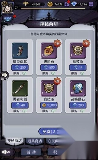 1、【必买】火柴商行里的神秘商店每天都有好几次免费刷新,看到可用金币购买的进阶石、幸运卷、伙伴经验就买它买它买它!6折钻石的高能晶石也是很划算的哦!