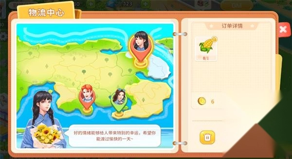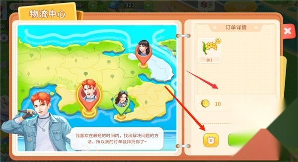 4、订单所需货物下方,显示经验与金币,如果不满意想要替换订单,可以点击下方垃圾桶按钮,来进行订单删除,在规定时间内更换成新的订单。