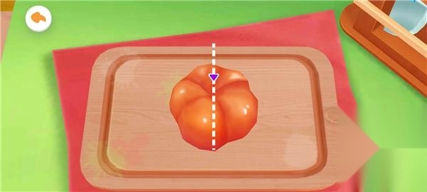 2、根据提示进入,拉动屏幕中的虚线,将西红柿切开。